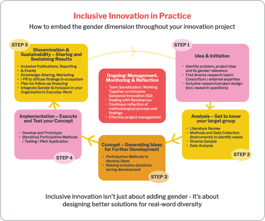 This section of our support package will guide you step by step through the entire (research) project cycle. We highlight common challenges, offer practical advice, and explain what to keep in mind when integrating gender and inclusion throughout your innovation process.